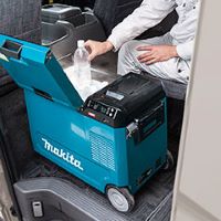 マキタの充電式工具に使う「40Vmax リチウムイオンバッテリ」または「18V リチウムイオンバッテリ」で稼働する、容量29Lの冷温庫。両側から開閉可能なドアと冷蔵/冷凍を同時にできる2部屋モードを備えています。