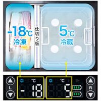 天面のドアは両側から開閉でき、スペースの限られる車内での使用や複数人での使用に便利。ドアは取り外し可能なため、ドアや庫内も洗浄しやすくなっています。庫内は仕切り板をセットすることで自動で「2部屋モード」に切り替わり、左右の部屋で異なる温度設定で使用可能。カラーは青とオリーブの2色展開。