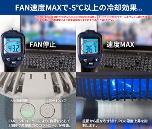 CPUやGPUは負荷により発熱し、適正温度を超えると、熱による故障を防ぐサーマルスロットリング機能により性能が低下することがあります。しかし、ノートPCクーラーを使用し効果的に放熱を行うことで、ベンチマークソフトのスコアでは約6%性能低下を抑えられることが確認できました。