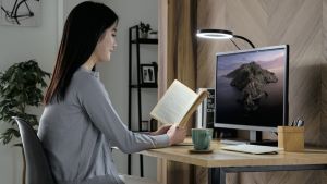 フレキシブルアームを備えているため、ライトの角度や位置を微調整することが可能。手前に折り曲げることでデスクライトとしても使用でき、手元を明るく照らします。使用しないときはモニターの裏にライトを収納できるため、部屋をスッキリ見せることができます。