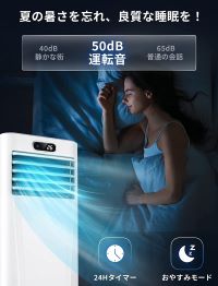 6~8畳の空間に対応できる小型クーラーで、冷房、除湿、送風の3種類の動作モードを搭載。風量は2段階で変更でき、24時間タイマー機能や自動霜取り機能も備えています。静音設計で、就寝中にも使いやすくなっています。