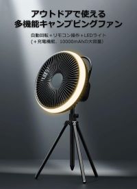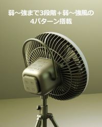 大容量10000mAhバッテリー搭載でスマホや他デバイスの充電が可能。風量調節は4パターン(弱~強・弱・中・強)搭載。三脚スタンドの着脱が可能で卓上・吊下げ・スタンドと3通りの使い方ができます。