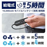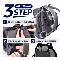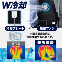 モバイルバッテリーで使えるUSB給電式で、ペルチェ+ファンの強モードなら約4時間、弱モードなら約5時間稼働します。上部のバックルと下部の面ファスナーで固定でき、リュックだけでなく椅子や車のシートでも使用可能。本体サイズは420×300×100mm(幅×高×奥行)で、重量は約600g。