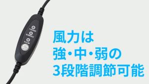 風量は弱・中・強の3段階で調節可能。使用時には別売のモバイルバッテリーをつなぎます。容量10,000mAhのモバイルバッテリーを使う場合、弱モードで約13時間駆動。強モードの場合でも約4時間使うことができます。