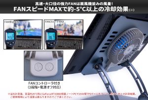 自宅のデスクなどでノートPCを快適に使用するためのアルミ製スタンドに、高性能な冷却FANを搭載した製品です。FANはオン/オフ可能で3段階の速度調節が可能で、通常のパソコン作業時のFANスピードは騒音少なめに設定しておき、レンダリングなどの負荷の高い作業を行う際には速度を上げて強力に冷やすといった運用が可能です。