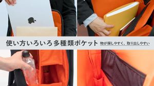 メインスペースはたくさん収納できる大容量リュックでありながら、収納ポケットを増やし観音開きの構造を採用することで、開いただけで中身が一目で分かるようにしたとのこと。前面に13型のノートを収納できるスペースを備えるほか、メインスペースにはA4ファイルやタブレットを収納可能。よく使うものは上段に収納でき、内側に4つのポケットを備え、小物を格納できます。