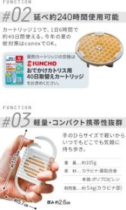 本体はポリプロピレン製で軽量コンパクト。上下はカラビナになっていて、服やバッグなどいろいろなところに装着できます。薬剤カートリッジはKINCHOの「おでかけカトリス」用のものを使用し、1日6時間で約40日間使えます。