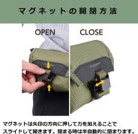 マグネットは矢印の方向に押して力を加えることで、スライドして開きます。閉める時はフラップを閉じるとマグネットで半自動的に閉まります。カラーは、オリーブ、ブラック、コヨーテの3色。