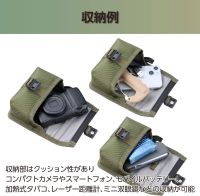 ケース内側はクッション性があり、収納物を優しく保護します。 本体側のバックルの位置を調整すれば、高さ約80mmまでの物を収納することが可能です。←コンパクトカメラやスマートフォンとモバイルバッテリー、レーザー距離計、ミニ双眼鏡など。
