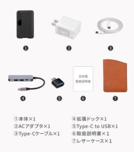 小さな白い化粧箱に本体のほか、インターフェイスを追加する拡張ドック、ACアダプタや充電ケーブルなど、RY-P1を利用するために必要な一式も含まれています。