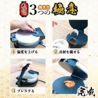 せんべいを焼く手順はたったの3つ。温度を上げて具材を載せ、プレスするだけで簡単にせんべいの完成です。上手に焼くコツは、食材のサイズと置く位置、焼き加減調整です。直径8cm以下、厚さを3cm以下の食材を用意し、中心よりも奥に置きます。