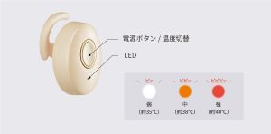 ヒーターは耳穴に入る中央の突起部に搭載。温度は「弱(約35℃)/中(約38℃)/強(約40℃)」の3段階で調節可能。約20分の自動オフタイマーを備えています。