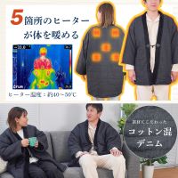 そのままでも暖かい半纏に電熱ヒーターが5箇所入った、電熱半纏「ほかてん」です。羽織るだけで温かい半纏の良さと、最新の電熱ヒーターの融合で、最高に快適な防寒着が完成です。首回りから腰のあたりまでフワッと暖かく包み込んで、薄着でもポカポカと暖めてくれます。