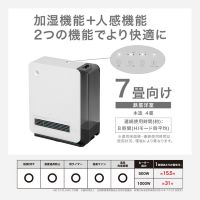 セラミックヒーターに加湿機能を搭載。自然に加湿量を調整する気化式を採用し、乾燥はもちろん加湿のし過ぎを抑えます。タンク容量は約2.2Lで、連続加湿時間は約13〜8時間。加湿フィルターの交換の目安は、1日8時間の使用で12〜18カ月。