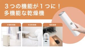 衣類、布団、靴、クローゼット、靴箱など、家中の様々な物を乾燥できるスティック型の衣類乾燥機。複数のアタッチメントが付属し、付け替えることで様々な用途に対応します。