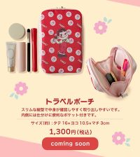 スリムな縦型のトラベルポーチ(1,300円)のサイズは約105×30×160mm。仕分けに便利な内側ポケットとミルキー型のオリジナル引手付き。