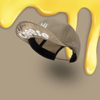 帽子のフロント面に「Hi」、ツバの裏側に「Cheese」の文字をデザイン。製品情報ページでは、撮影者が「ハイ! チーズ!」とおどけてみせる様子が使用例として紹介されています。