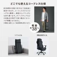 軽量でコードレスのため、好みの場所で使用が可能。連続使用時間は約70分、充電所要時間は約3時間。レザー(合皮)部分は耐アルコール仕様。汚れても消毒スプレーで拭き取れるとのこと。
