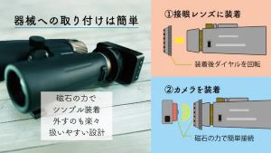 接眼レンズの外径が22~46mm範囲内の双眼鏡や望遠鏡に録画機能を後付けできるカメラユニット。撮影解像度は、最大1080p・30fps。利用には、調節アジャストユニットを接眼レンズ部に装着し、磁石によってカメラユニットを調節アジャストへと装着。