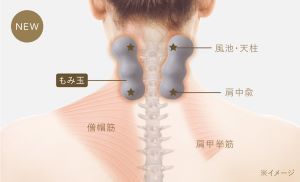ふわふわとした触り心地とヒーターで、じんわりと温めながらもみほぐすネックマッサージャー。首筋に沿ったウェーブ状のもみ玉が、首のコリを挟んでもみほぐします。