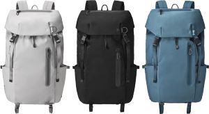 外側に3つのポケットと折りたたみ傘やボトルを収納できる両サイドポケットを配置。中には15インチPC対応のスリーブポケットと仕分けに便利な小物ポケットも搭載。カラーはライトグレー、ブルーグリーン、ブラックの3色展開。