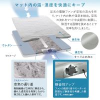 マット内を除湿して、熱のこもりを低減する寝具。足元の電動ファンで空気の流れを作り、マット内部を換気することで、温度・湿度の上昇を持続的に抑えます。マット内部には、空気の通り道となる樹脂繊維が立体的に構成された「三次元ファイバー」を備えています。
