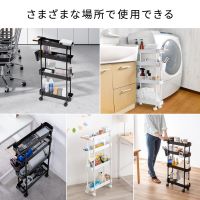 サイズが17×51×84cmとスリムなキャリーワゴン。4つの収納棚を備え、各棚はほこりが溜まりにくいメッシュ底面を採用。棚の側面に引っかけて使えるポケットも付属します。本体はスチール製で、移動に便利なストッパー付きキャスターやハンドルも装備。