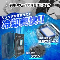 背中に風を送るファンも搭載、ファンの強弱は2段階(Hi/Lo)で調節可能。電源はUSB給電式。冷却ユニットに付属するケーブルに、モバイルバッテリー(別売)を接続して使用します。冷却プレートの電源をONにして、風量強(Hi)にした場合の動作時間は約3.5時間。
