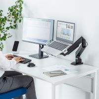 対応VESAマウントは75mmピッチ。ノートPC取付部は左右に伸縮するアームで保持する構造で、14~17.3型(幅290~450mm)、重量3kgまでのノートPCに対応可能。モバイルモニターも装着可能。