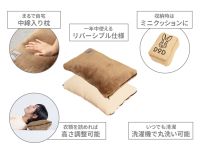 ミニウサクッションマクラは、寝室、リビング、車の中など、あらゆる日常のシーンに溶け込むアイテムです。中綿入りの枕で家庭用枕のような柔らかさを実現し、枕のなかにタオルや衣類を挟むと高さ調節ができます。