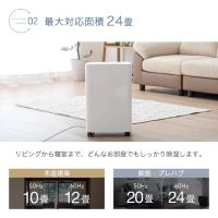 ヒーターを使わない方式のため室温がほとんど上がらず、夏でも快適に使える点も特徴。風量設定は2段階。対応面積は50Hzが木造10畳/鉄筋20畳、60Hzが木造12畳/鉄筋24畳。希望の湿度に合わせて除湿運転を行なう「湿度設定モード」を搭載し、部屋の湿度を40〜70%に10%刻みで設定可能。さらに住環境で快適とされる湿度60%に保つことができる「おまかせモード」も搭載します。