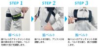 装着する際は、脚・脇・胸ベルトをそれぞれ調整するだけ。誰でも簡単に装着可能。本体の一部にはメッシュ素材を採用し、体への接触面が少ないため、長時間の使用でも蒸れにくくなっています。またLサイズの重さが、500mlのペットボトルよりも軽い約450gと軽量。適応身長の目安はMサイズが155〜172cm、Lサイズが168〜185cm。