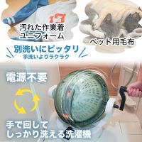 使い方は、球体の下半球の洗濯槽に洗濯物・洗剤を入れたら上半球をセットし、給水ホースから水を投入。本体横にセットしたハンドルを回すと洗濯槽が縦に回転し、衣類を上部から下に叩きつけ洗いして汚れを落としていいきます。水温は40℃まで対応。