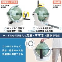 排水レバーを上げると、土台部の排水口から排水。ハンドルを天面部に差し替えて回転させることで脱水もできます。1回ハンドルを回すと約5.5回転し、高速で脱水が完了。洗濯槽や土台部分は丸ごと水洗いができるため手入れも簡単。排水・給水ホースは洗濯槽に保管できます。