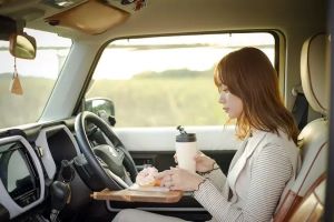 ハンドルに『車載デスク』を取り付けるだけで車内が「書斎」に大変身。ノートパソコンを持ち込んで企画書立案や伝票整理、文字入力など会社や自宅でできることを車の中でも可能にします。蝶番が付いているため、使わないときはドアポケットやシートバックのポケットに収まる大きさにたたんでおけます。