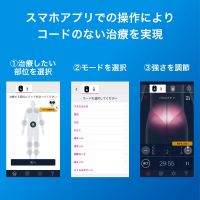 従来の低周波治療器にあった本体とパッドをつなぐコードをなくし、スマートフォンで治療モードや強度を簡単に操作できるようになりました。そのためコードを気にすることなく、遠征先やジムでのトレーニングの合間や移動中など好きな場所で使用できます。