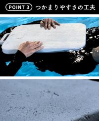 天板の色も水面で目立つように、裏表にそれぞれモルタル調の白と、セーフティーオレンジのカラーを採用。さらに、ハンドル部分は持って投げたり、ロープを結んで投げたりすることも可能。コンクリートを使って型を取ることにより、凹凸のある質感でグリップ効果があり、水に濡れた手でもつかみやすい。