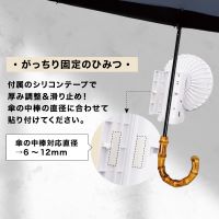 日傘への取り付けは簡単。付属のシリコンテープで厚み調整と滑り止めを行い、傘の中棒の直径に合わせて貼り付けます。傘の中棒は6~12mmに対応します。