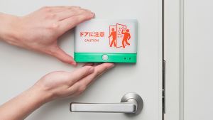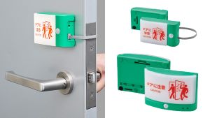 有線タイプは、ライトの点滅で扉の反対側に人がいることを知らせる。今回のリニューアルで表示部をシートから樹脂製カバーに変更し、耐久性を強化した。電池寿命も約2年と約4倍に向上。頻繁に電池交換する必要がありません。