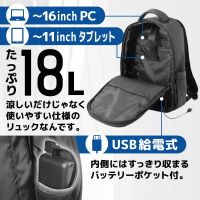 内容量は18L。内側ポケット部分に16インチのパソコンを収納可能。外装にはポケットを備えるほか、側面にボトルホルダーを搭載。本体サイズは290×170×580mm(幅×奥行き×高さ)。重さは約1.3kg。
