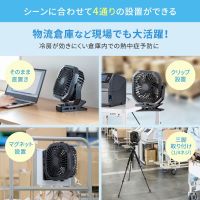 FAN-USB1BKは、直置き、クリップ設置、マグネット設置、三脚取り付けの4通りで使用できる5枚羽根構造のUSB扇風機。物流倉庫のカートやカゴ台車などに固定でき、物流現場に適しているとのこと。風量は弱、中、強、自然風の4段階で、吹き出し口の向きは縦および横方向に360度調節可能。