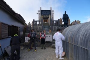 標高が上がるにつれ、気温は下がりますが、それでも大量の汗をかきますので、タオルと水分補給が欠かせません。途中に山小屋が三つあり、座って休憩を取ることが出来ます。剣ヶ峰に着いたのは10時30分、それほど広くない山頂には大勢の登山客がいました。山頂には10年前に発生した噴火災害の慰霊碑、シェルター、噴火ガスで変色した銅像があります。それほど広くない山頂付近で58名が亡くなり、5名が行方不明というのは現場に来ると胸に迫るものがあります。殆どの方が頭部損傷で亡くなったことから、山頂付近は今もヘルメット着用となっています。山頂から少し下って二の池山荘やサイの河原付近まで行きたかったのですが、想定以上に脚に来ていたこと、帰りのバスの出発時刻考慮して来た道を、足元に気をつけながらピストンで下りました。