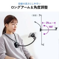 アーム部分は29cmで、スマホの位置を自由に調整できます。首かけ部分はシリコン素材を採用して痛くなりにくく、リリースボタンにより取り外しも容易。首周りは約62cm。