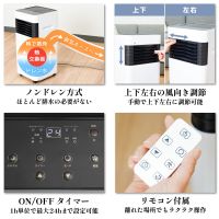 温度は15~31℃に設定でき、風量は「強/弱」の2段階に切り替え可能。また、付属の二股送風ホースで風向きを自由に調整でき、風を2方向に分けて送ることもできます。運転モードは「冷房/送風/除湿/自動運転」の4種類で、1〜24時間のオン/オフタイマー機能を搭載。キャスター付きで移動させやすく、季節や部屋の状況に合わせて快適に使えるとのこと。