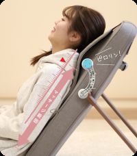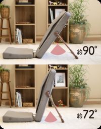 使わないときは折り畳んで厚さ約20cmまでコンパクトになり、家具のすき間などに収納可能。限られたスペースでも気兼ねなく使用できます。背もたれ部分には約90度と約72度の2段階で調節可能なリクライニング機能を搭載。このほか、座面裏にはすべり止めを設けているため、備え付けのスタンドを使わず、背もたれのあるソファや椅子に設置して使用することもできます。