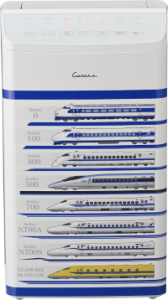 新幹線の車体を思わせる白くスリムな本体正面に、0系から最新のN700Sまでの東海道新幹線の歴代車両をデザイン。2025年1月にT4編成が引退したドクターイエロー、JR西日本の500系車両と合わせた計8台のシールがあしらわれています。