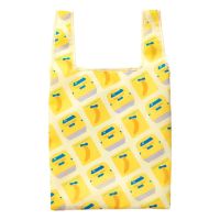 バッグ本体は、東京ばな奈の生地を思わせる優しい色合いのイエロー地で、東京ばな奈とドクターイエロー(T4編成)を大きく描いています。反対面は2つのロゴを敷き詰めたデザインになっています。