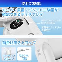 ファンは風を一点に集中させる設計。風量は5段階で調整可能。ファンの角度は無段階で調整でき、手持ちや卓上に置いて使えるほか、付属のストラップを使うことで、首に掛けて持ち歩くことができます。冷却プレートモードや風量、バッテリー残量が一目でわかる視認性の高いディスプレイを搭載。