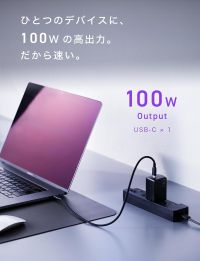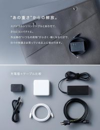 同出力帯の純正充電器と比べて、体積で約63%減、重量は約59%減を実現したという小型モデルで、既存のCIO製品では67Wモデル(3ポート)に近いとのこと。