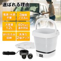 コンセントが近くになくても使える充電式モバイル洗浄機。大容量12Lのバケツ一体型のため水栓がない場所でも使用でき、掃除や植栽の水やり、キャンプや海水浴まで様々なシーンに対応します。フタ付きで軽量なため持ち運びやすく、バケツ部は折りたたんで収納可能。